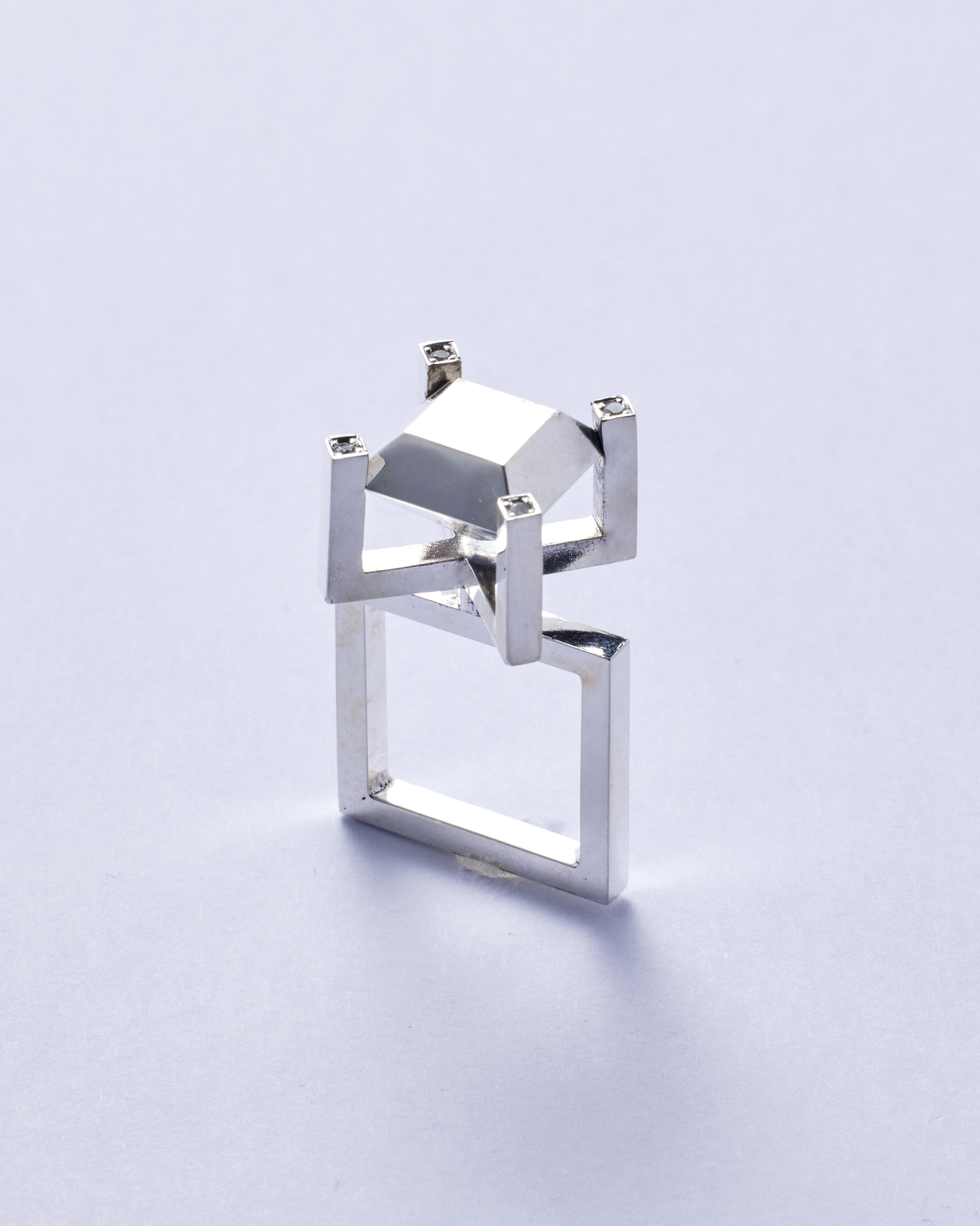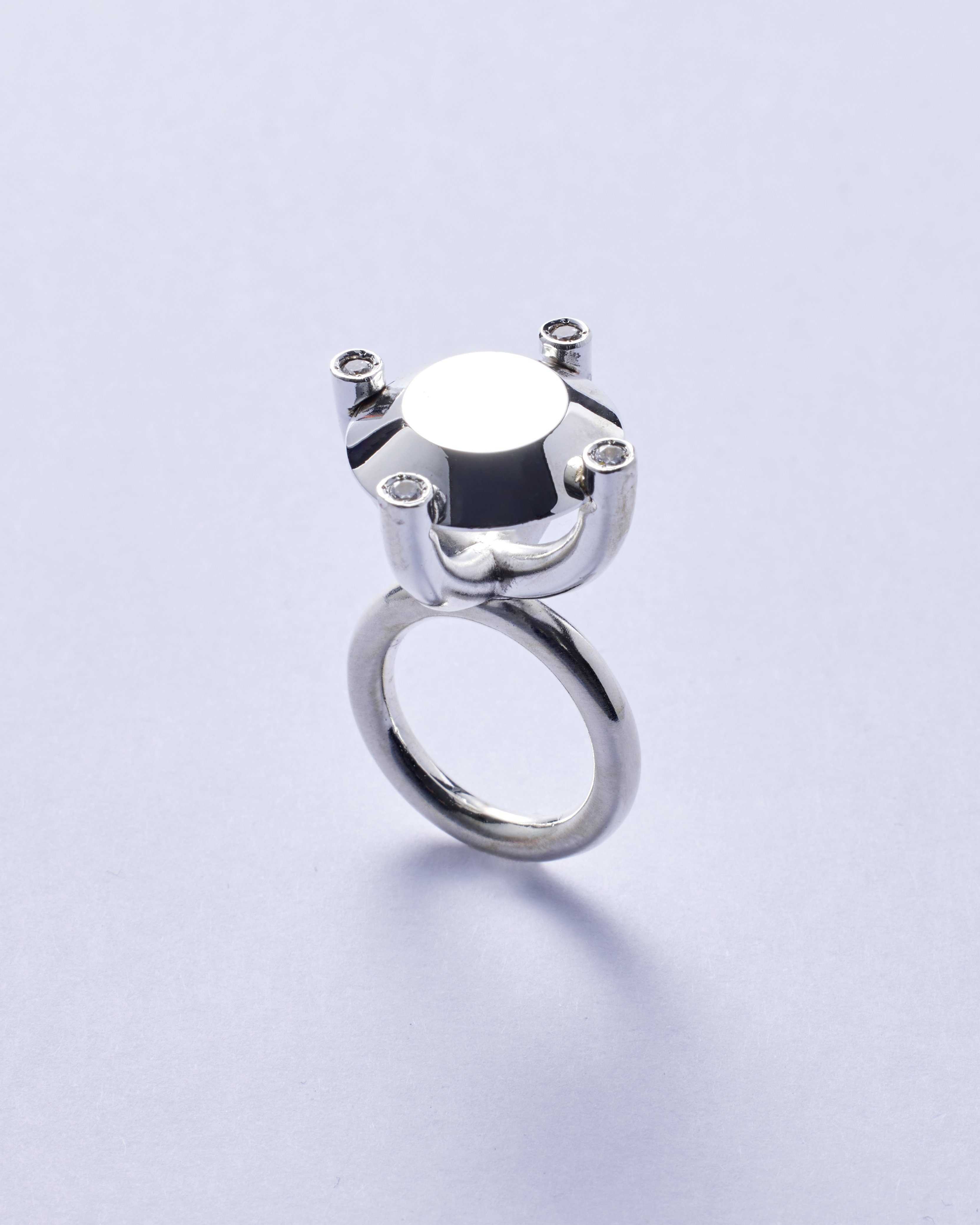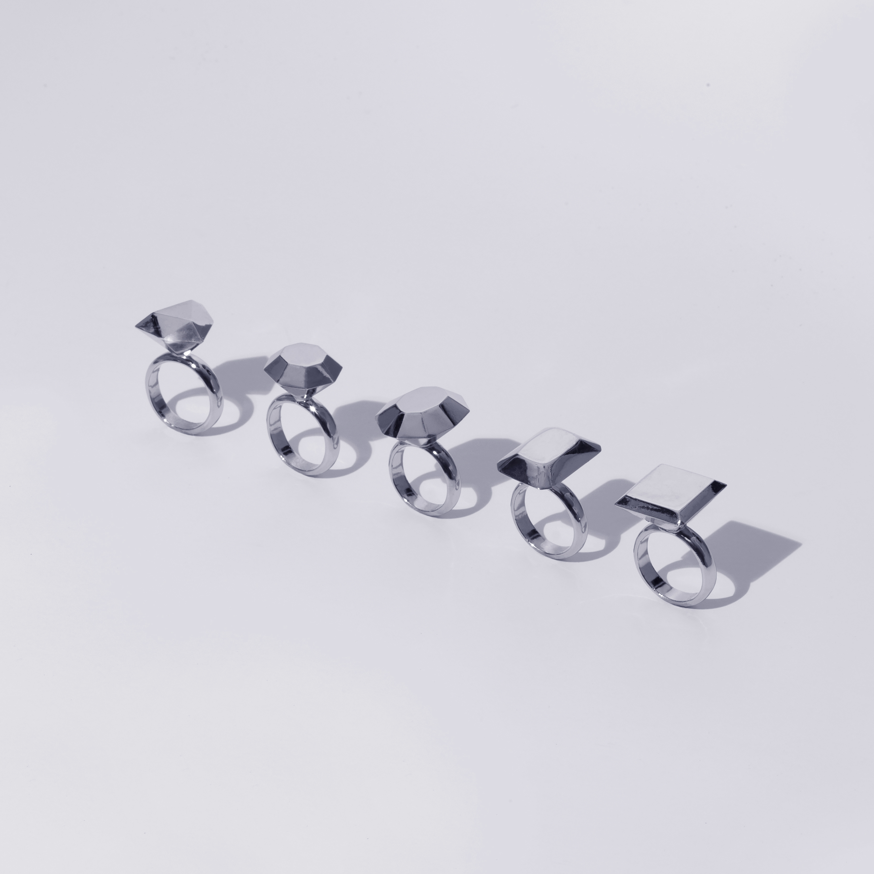 These rings recreate various cuts of the diamond in silver. Each form is hollow inside, feigning solidity — a utopian gesture to those still faithful to the original.