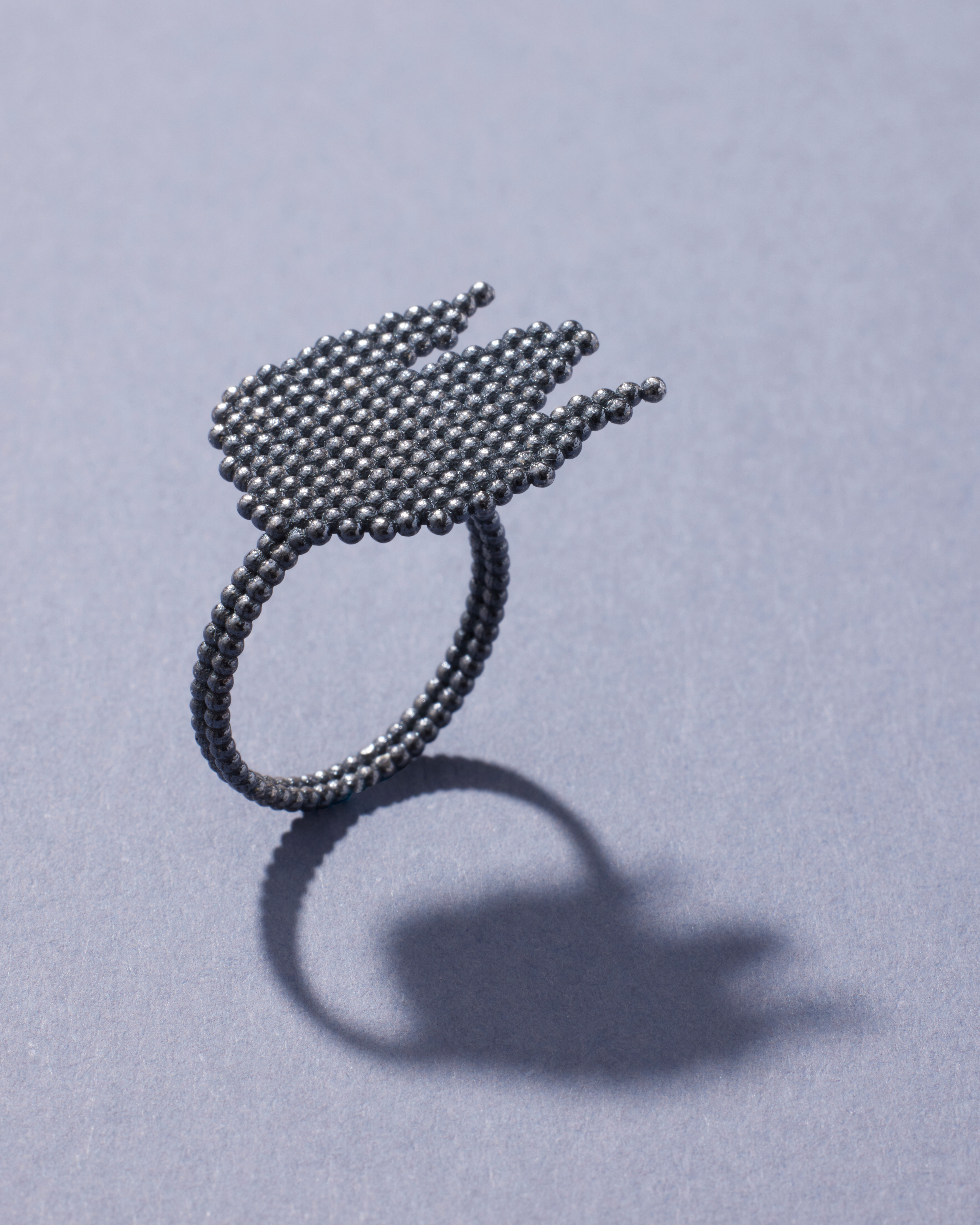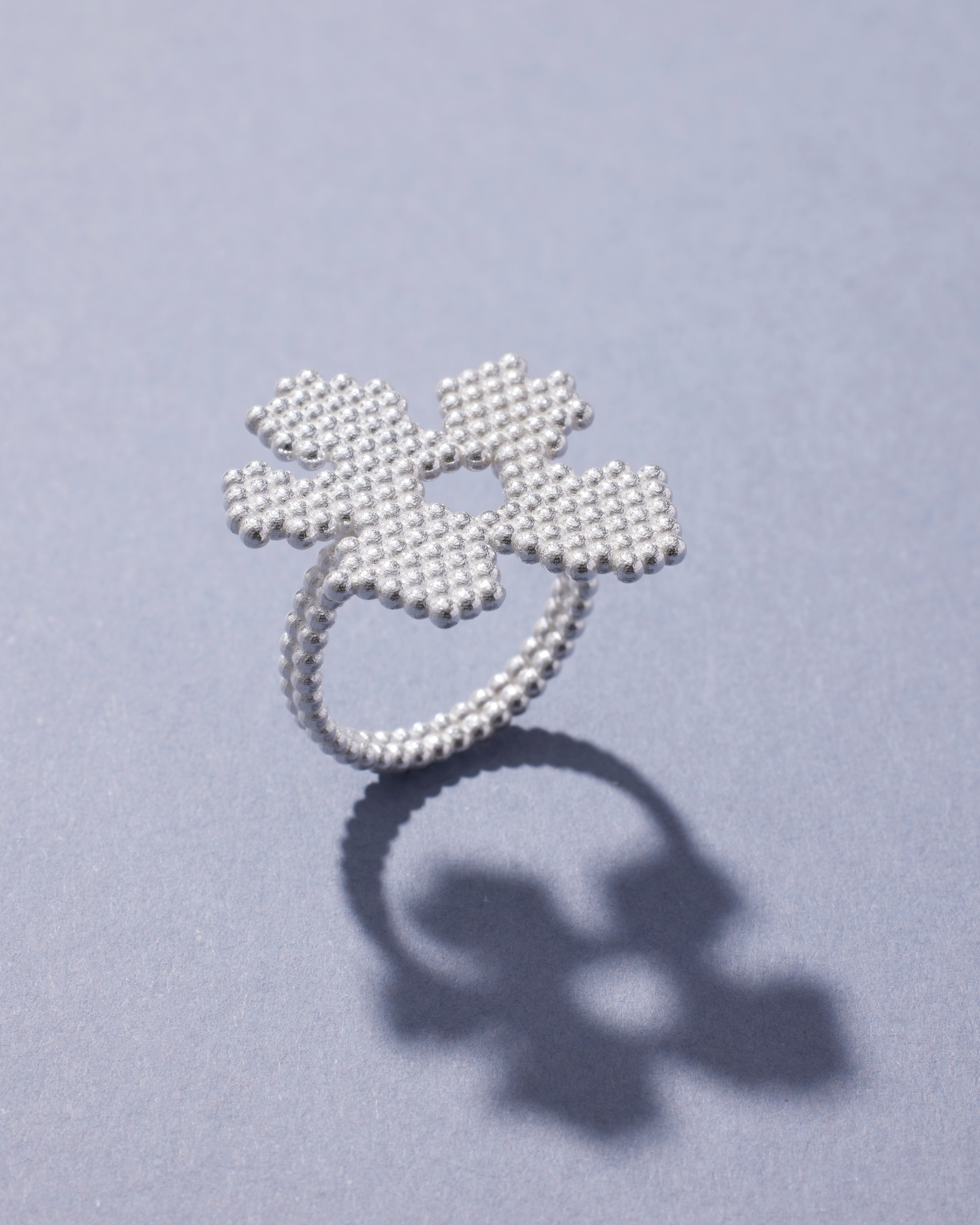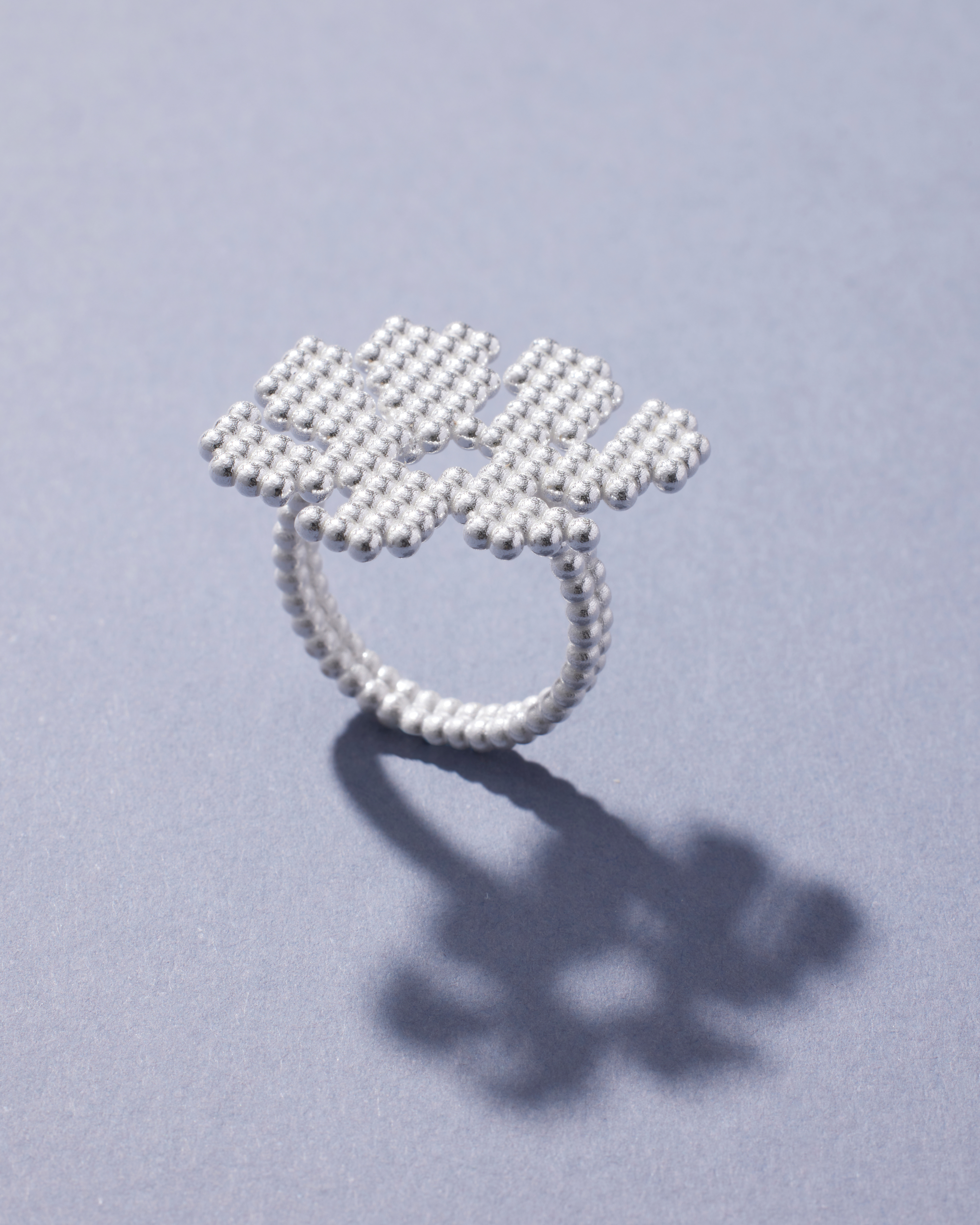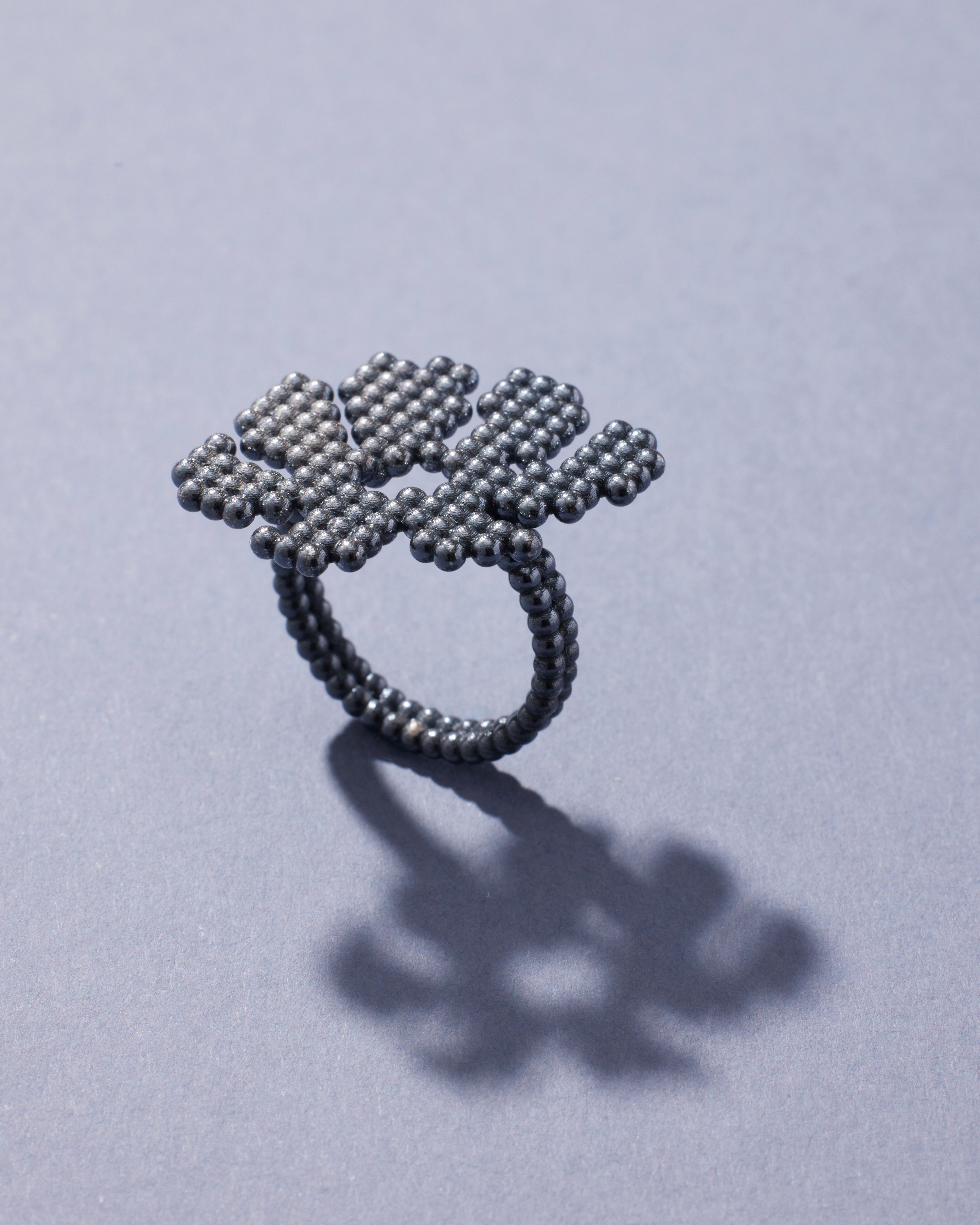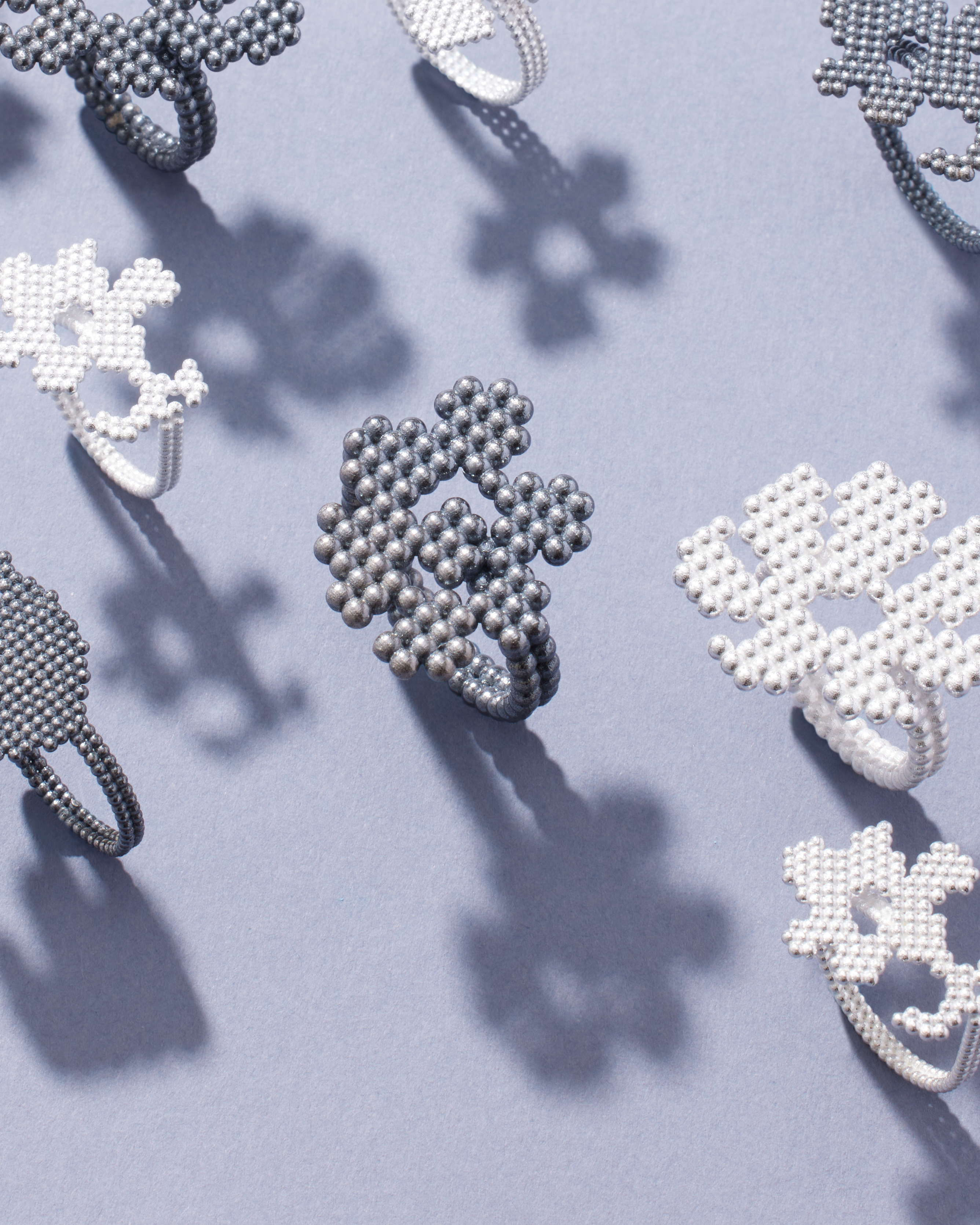These pieces began with an 18th-century embroidery book found in a museum archive — designs that looked, despite their age, startlingly contemporary. Pixelated, domestic, patient. The same grids that once lived in women’s hands, translated here into silver through accumulated spheres of metal.