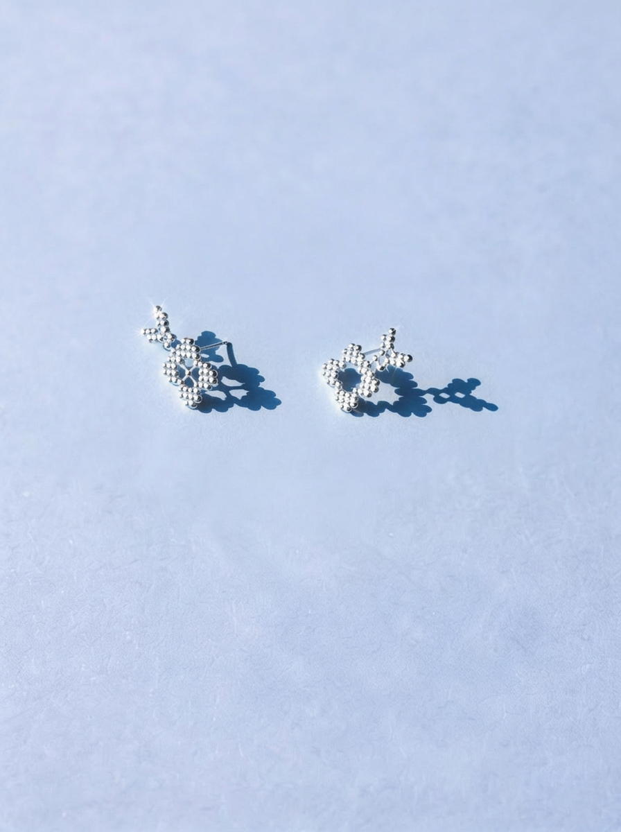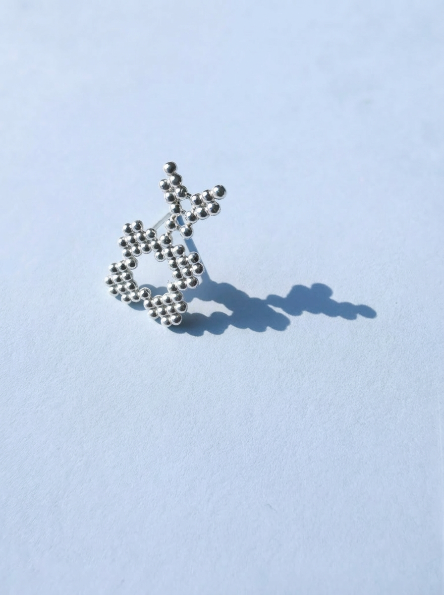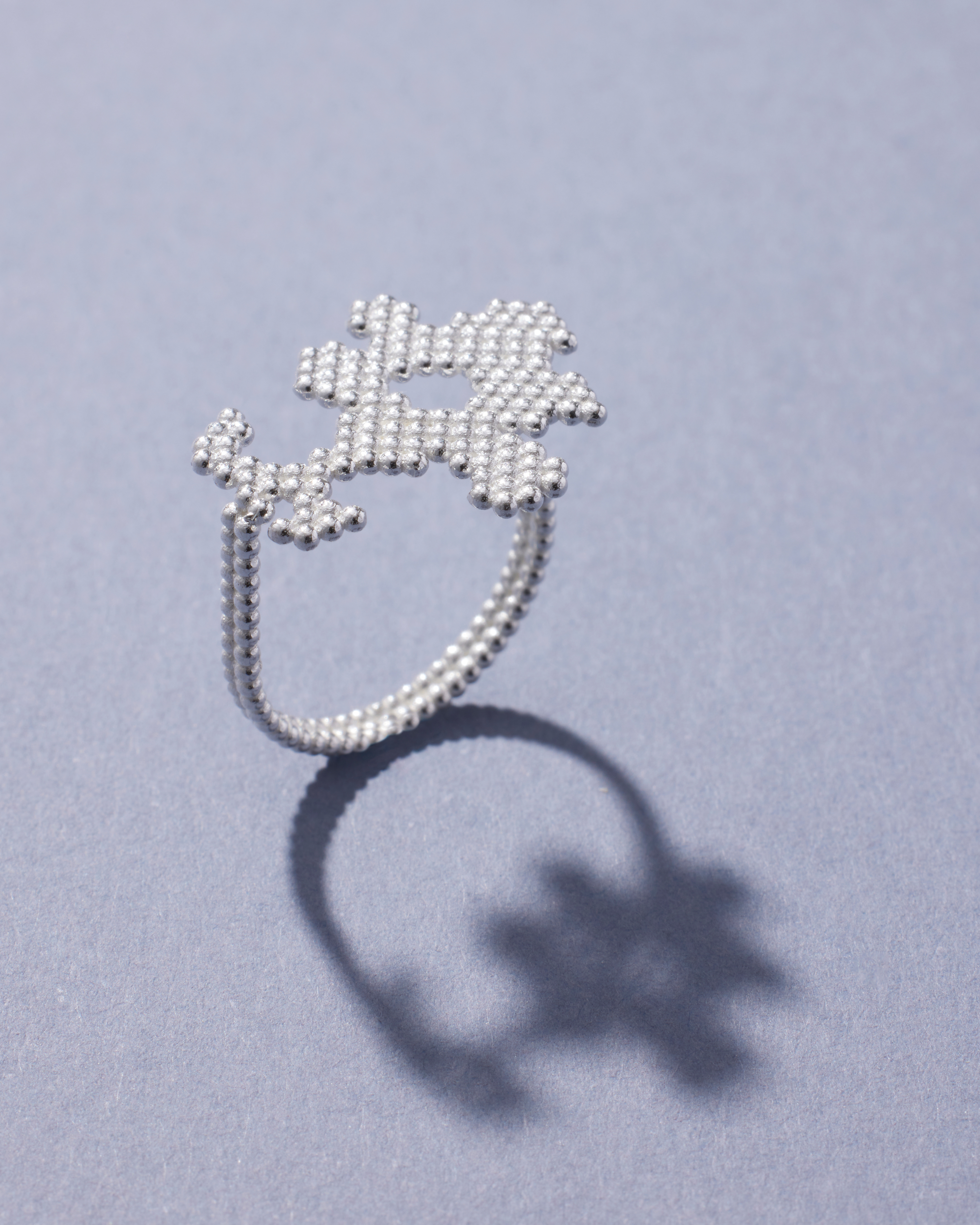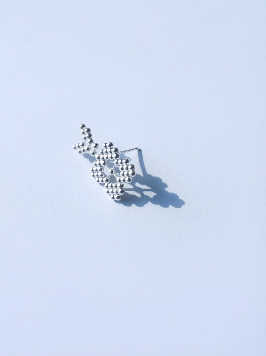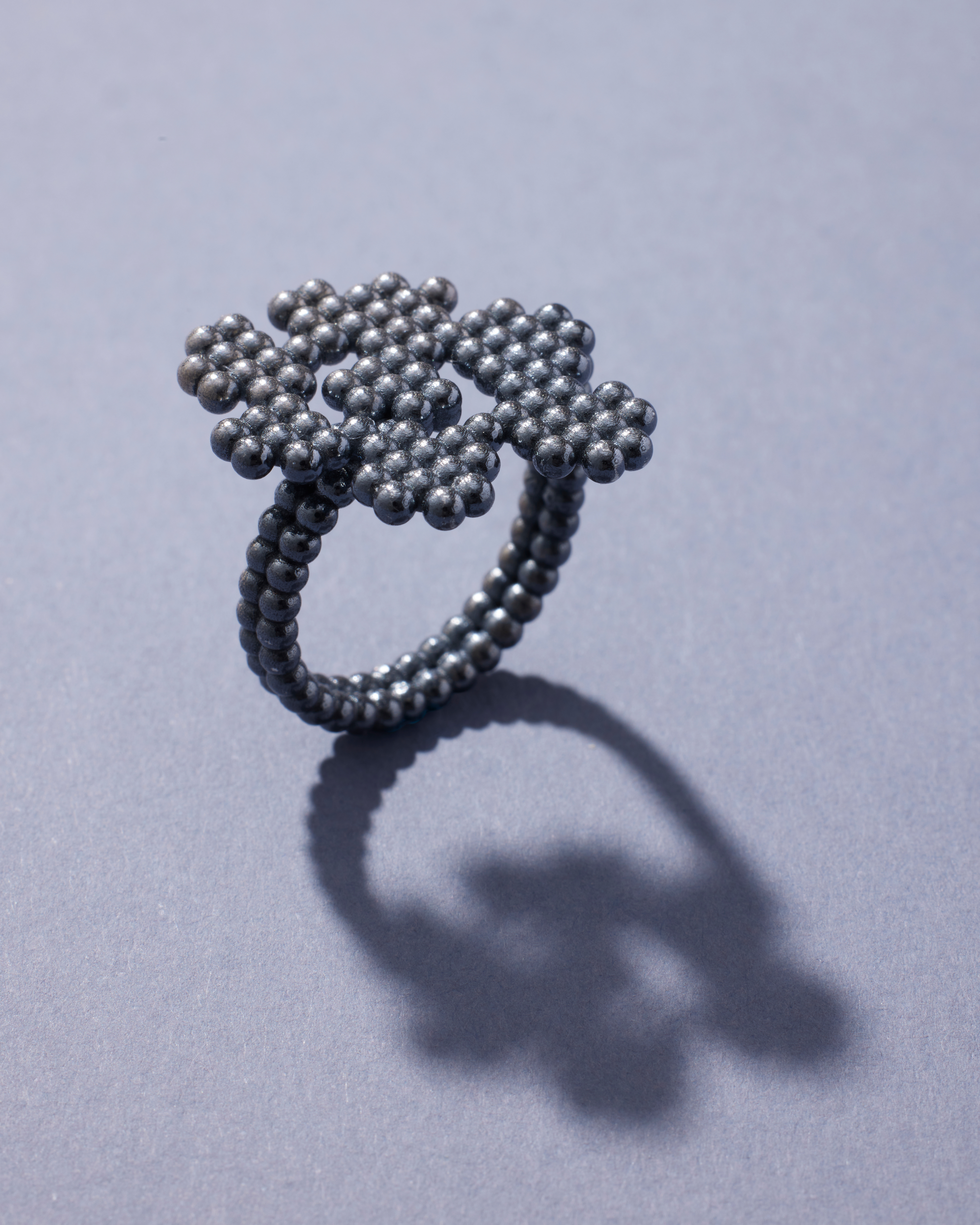 These pieces began with an 18th-century embroidery book found in a museum archive — designs that looked, despite their age, startlingly contemporary. Pixelated, domestic, patient. The same grids that once lived in women’s hands, translated here into silver through accumulated spheres of metal.